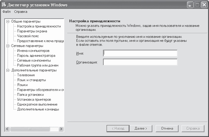 Нажимая кнопку Далее, вы будете последовательно перемещаться по пунктам, которые отображаются в древовидной структуре в левой части окна (вы можете вернуться к любому пункту, просто выбрав его в этой структуре). Следуя подсказкам диспетчера, необходимо ввести информацию о пользователе, организации, регионе, языке, сетевых устройствах и параметрах, настройках экрана и т. п. (все данные, которые вы вводили бы вручную в процессе установки). Кроме того, для создания файла ответов нужно ввести серийный номер вашей версии операционной системы.
