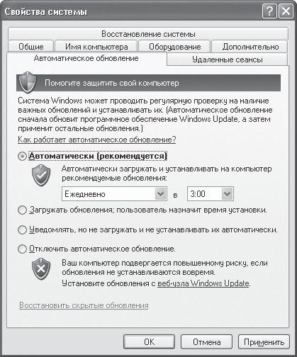 По умолчанию обновление операционной системы происходит в автоматическом режиме. Чтобы получить доступ к настройкам автоматического обновления системы, выполните команду Пуск Панель управления, выберите категорию Производительность и обслуживание, щелкните на значке Система и в открывшемся окне Свойства системы перейдите на вкладку Автоматическое обновление (рис. 1.26).