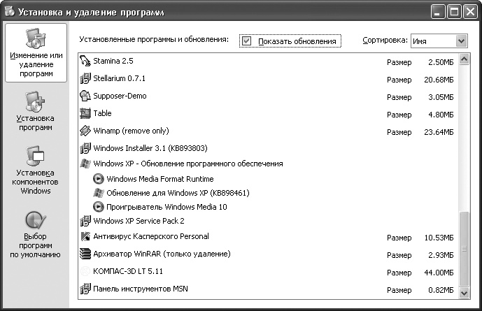 Вы сможете ознакомиться со списком установленных обновлений, выполнив команду Пуск Панель управления, выбрав категорию Установка и удаление программ и установив в открывшемся окне флажок Показать обновления (рис. 1.27).