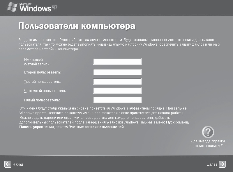 Далее следует указать имя своей учетной записи (администратор компьютера) и имена учетных записей пользователей, которые будут работать на данном компьютере кроме вас (рис. 1.12).