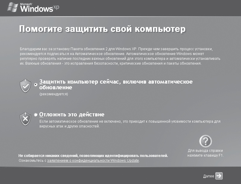 В первом окне мастер предложит включить или отключить систему автоматического обновления Windows XP (рис. 1.11).