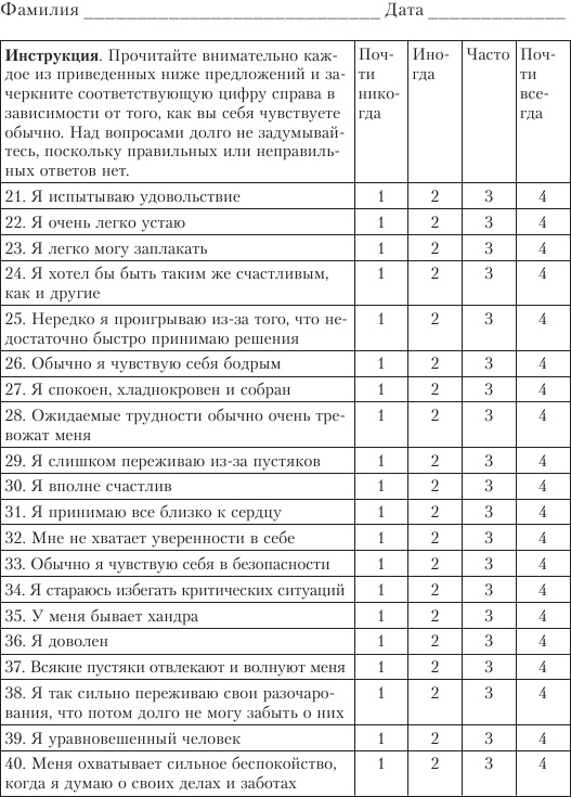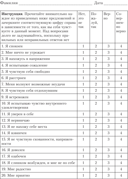 Методический (стимульный) материал. Шкала самооценки состоит из двух частей, раздельно оценивающих реактивную (РТ, высказывания 1-20) и личностную (ЛТ, высказывания 2140) тревожность.
