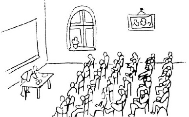 26. Вот человек, хорошо тебе известный. Он что-то говорит сидящим на стульях. Ты находишься среди них. Обозначь крестиком, где ты.