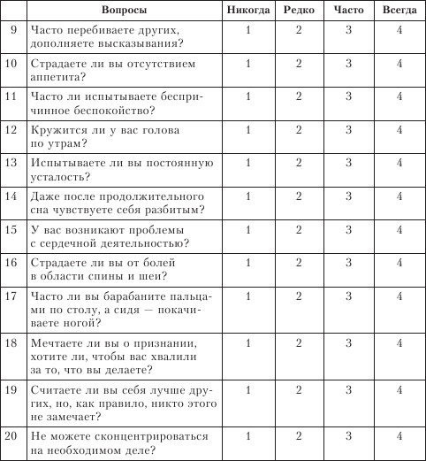 Для оценки нервно-психического напряжения (стресса) в отечественной психологии используется хорошо известный опросник Т. А. Немчина (1988) и Ч. Д. Спилбергера (1966).[5] Ниже мы предлагаем малоизвестную шкалу для измерения психологического стресса.