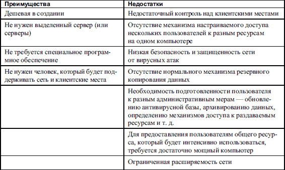 В табл. 2.1 перечислены основные преимущества и недостатки одноранговой сети.