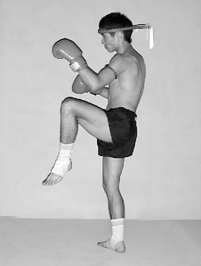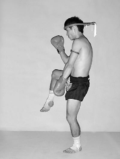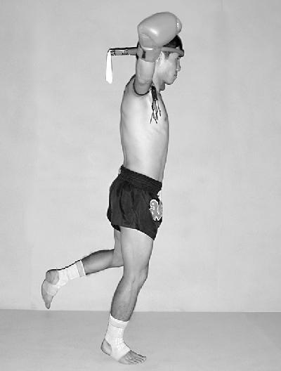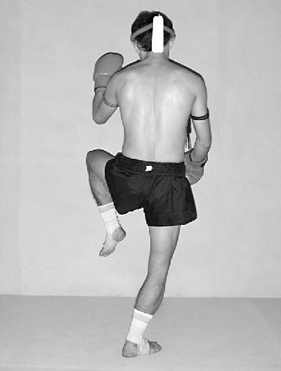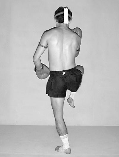 Опустите правую ногу вниз. Соедините руки вместе и расположите перед грудью. Стопы прижаты к поверхности ринга. Голова слегка опущена к рукам (фото 37).