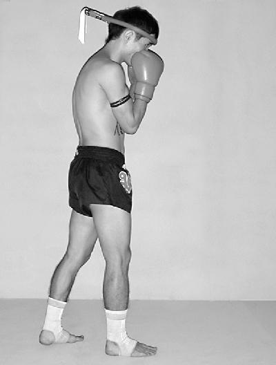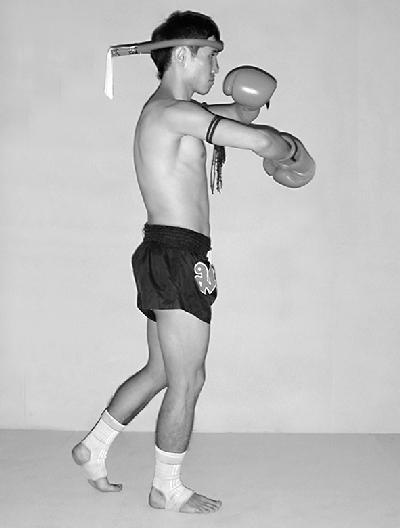 Опустите пятку правой ноги на поверхность ринга, стопу правой ноги поставьте сзади на носок. Верните руки в положение перед грудью и выполните круговое движение предплечьями (фото 39).