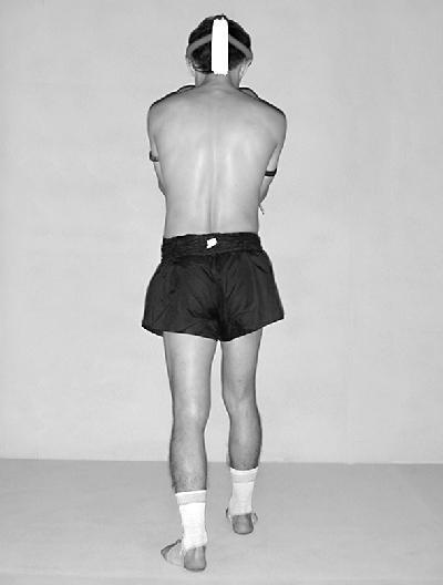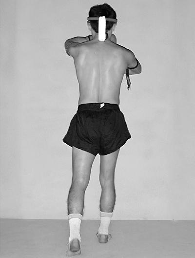 Опустите левую ногу и левую руку вниз. Выполните три небольших шага назад. Поднимите вверх бедро правой ноги и правую руку. Правая рука, согнутая в локте, расположена над бедром поднятой ноги. Одновременно левая рука опускается слева вдоль туловища вниз. Бедро правой ноги и стопа опорной ноги слегка развернуты. Угол сгибания в колене около 90 градусов. Взгляд направлен вперед (фото 56).