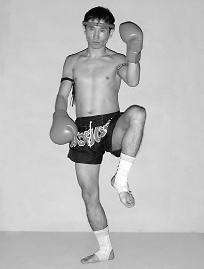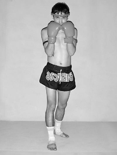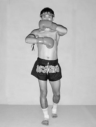 Опустите левую ногу вниз на поверхность ринга, выполните шаг вперед правой ногой. Верните руки в положение перед грудью. Голову наклоните слегка вперед. Взгляд направлен вперед (фото 52).