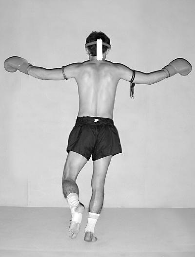 Опустите стопу правой ноги на поверхность ринга и поставьте на носок. Верните руки в положение перед грудью и выполните круговые движения предплечьями. Взгляд направлен вперед (фото 54).