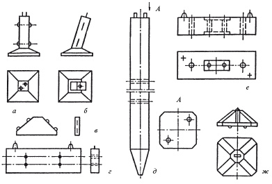 Рис. 1.1. Детали сборных железобетонных фундаментов опор ВЛ: а прямой подножник; б наклонный подножник; в пригрузочная плита; г ригель; д свая; е ростверк; ж анкерная плита для крепления оттяжек
