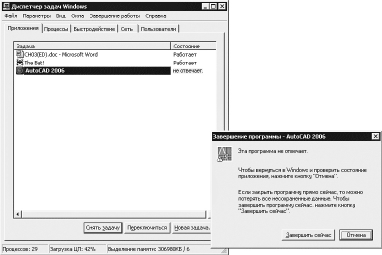 Рис. 1.2. Диспетчер задач и окно Завершение программы