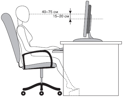 Правильная посадка за столом. Расстояние от глаз до монитора должно составлять 4075 см, а центр экрана должен находиться на 1520 см ниже их уровня (рис. 2.2). Клавиатура располагается на расстоянии 1030 см от края стола таким образом пальцы будут находиться на уровне запястий, параллельно полу, а плечи будут расслаблены.