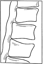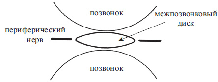 На рисунке 2 схематично изображен как раз позвоночно-двигательный сегмент. Мы видим два соседних позвонка. Между костными поверхностями позвонков лежит хрящевая прокладка межпозвоночный диск или хрящ, который более эластичен и упруг по сравнению с костью. Связки и мышцы на рисунке отсутствуют, поскольку наибольшее значение для понимания остеохондроза имеют «суставные» поверхности позвонков, обращенные к диску, сам диск и размер (высота) пространства между позвонками.