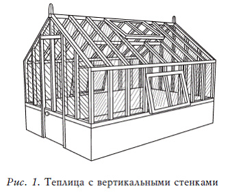 Это классическая теплица с вертикальными стенками (рис. 1), нижняя незастекленная часть которой хорошо удерживает тепло. В такой теплице эффективно используется место. Если выращивается овощная рассада и культуры в мешках с питательной смесью, можно использовать вариант с рамами, застекленными только до уровня земли.
