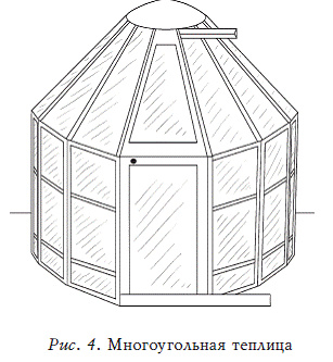 Теплица небольшого размера может иметь 6, 7 или 9 вертикальных граней (рис. 4). Подобные теплицы используют в основном для декорирования сооружений, располагают возле дома и оформляют растениями в горшках.