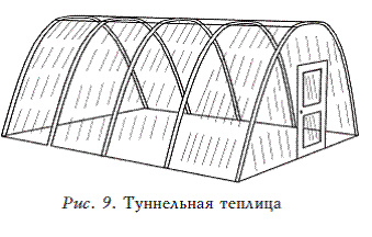 Этот вид теплицы считается самым дешевым. Он представляет собой полиэтиленовую пленку, натянутую на металлические дуги (рис. 9).