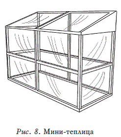 Такой вариант теплицы хорошо подходит для ограниченных пространств, поскольку имеет множество вариаций по длине, ширине и высоте (рис. 8). Кроме того, существуют также изолированный и колесный варианты. Сооружение может быть покрыто стеклом или пластиком и обычно имеет алюминиевый каркас. Располагать теплицу следует лицевой частью на юго-восток или юго-запад для получения максимального освещения. Полки и помосты имеют разные размеры.