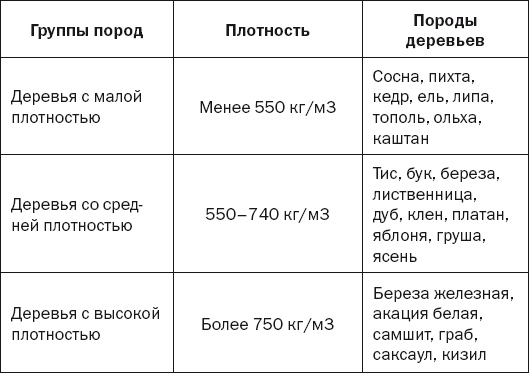 В зависимости от плотности древесины, выделяют три группы, представленные в табл. 2.