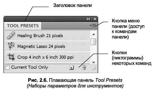 На панели Options (Параметры) в верхней части рабочего окна Photoshop расположены настройки текущего инструмента (рис. 2.8). Панель можно перемещать в рабочей области приложения или закрепить в верхней или нижней его части. Скрыть или отобразить панель можно командой Window (Окно) \ Options (Параметры). Вид панели зависит от выбранного инструмента.