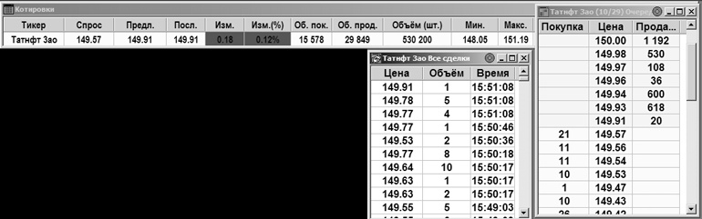 Ясно, что котировка отражает наилучшие цены спроса и предложения в данный момент на рынке. На примере из Рис. 5 в торговой системе выставлены и менее выгодные предложения на покупку-продажу акций ОАО «Татнефть», что можно наблюдать в так называемом «стакане» в правой части Рис. 5, где отражены следующие за наилучшими предложения на покупку или продажу этой бумаги по мере их ухудшения. Кроме цены в котировку включаются и количество ценных бумаг, которые желают продать или купить по ценам котировки. Бид и аск это собственно котировка, но обычно на интернет-серверах в нее еще включается информация о цене последней сделки (Посл.) по времени запроса на котировку, а также её изменение по отношению к цене закрытия вчерашнего дня (Изм., Изм%). Цена закрытия это цена самой последней сделки в торговом дне. Другие характеристики: самая высокая (Макс.), самая низкая (Мин.) цены сделок в данном торговом дне, а также цены открытия, то есть первой сделки торгового дня (Откр.) и закрытия, или последней сделки (Закр.)
