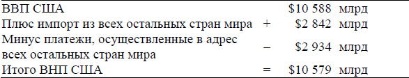 Разность между ВВП и ВНП обычно незначительна и, как правило, составляет менее 0,5 %. В табл.1.2, например, ВВП равен примерно $10 589 млрд, а ВНП $10 580 млрд, разность составляет около $10 млрд, или 0,09 %.