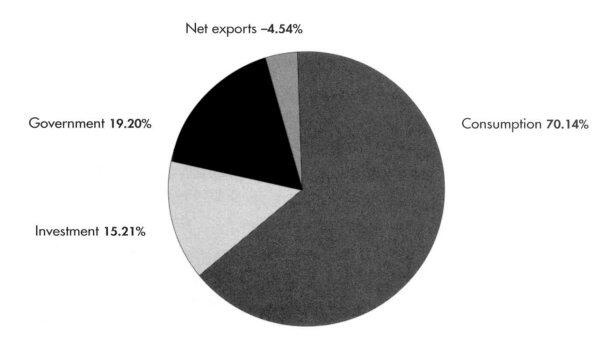 Услуги составляют намного большую категорию потребительских затрат. Сегодня услуги занимают около 59 % всех потребительских расходов по сравнению с третью этого объема (примерно) в 1959 г. Неудивительно, что о США говорят, что их экономика основана на оказании услуг. Второй по размеру затратной категорией являются расходы на товары кратковременного пользования около 29 % общего объема затрат. Расходы на товары длительного пользования наиболее изменчивый компонент составляют оставшиеся 11 %.