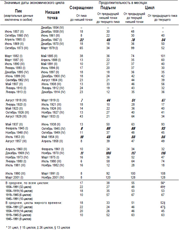Числа, выделенные шрифтом, это подъемы военного времени (Гражданской войны, Первой и Второй мировых войн, Корейской войны и войны во Вьетнаме), сокращения военного времени и полные циклы, включая подъемы военного времени