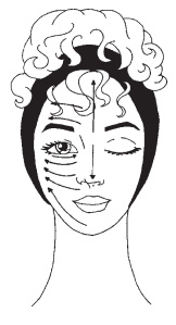 б) концами третьего и второго пальцев легко поглаживается верхняя часть щек в направлении от спинки носа к вискам;
