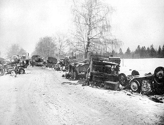 Брошенная немецкая техника на дороге из Клина. На автомашине в центре видно обозначение подразделения связи