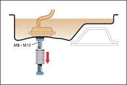 Если требуется выправить вмятину на поддоне картера двигателя, а сделать это мешает балка передней подвески, можно, приварив к поддону гайку М8 или М10, вытянуть вмятину «обратным молотком». Для этого в гайку нужно ввернуть болт со скользящим грузом (втулкой) (см. рис.) и несколькими ударами по головке болта вытянуть вмятину.
