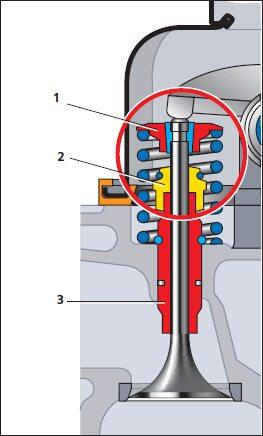 Причина оказалась такова. Направляющие втулки 3 клапанов могут быть недопрессованы примерно на 3 мм в отверстия головки, поэтому тарелки пружин 1 клапанов, доставая до колпачков 2 (см. рис.), не только сминают их, но и создают сильную вибрацию, посадка колпачков становится слабее, и они сползают с торцов втулок.