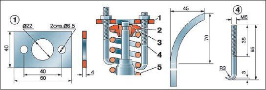 1 пластина; 2 тарелка пружины; 3 сухарь; 4 крюк; 5 пружина