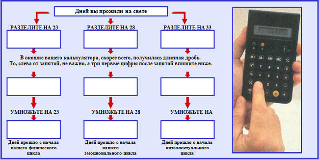 Как же рассчитать, какой день, какого из ваших циклов приходится на сегодня и когда ближайший критический день? По простой схеме, для которой нужен лишь калькулятор и карандаш. Больше можно ничего не считать, ведь циклы повторяются без изменений. Так что, если сразу занести в календарь эти три числа, дальше останется только прибавлять к ним в день по единице до 23, 28 и 33 дней соответственно. Далее следует отсчитывать цикл сначала.