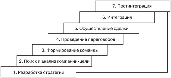 Следует отметить, что если рассмотреть алгоритм действий компании при осуществлении слияний и поглощений, то можно выделить 7 основных этапов (рис. 3).