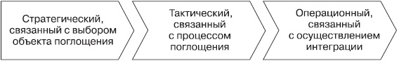 Конечно, стратегия слияний и поглощений вырабатывается на основе общей стратегии развития компании. На высшем уровне компании происходит оценка того, насколько слияния и поглощения соответствуют миссии и целям всего бизнеса, вписываются в общую его стратегию. По результатам такого анализа формируются цели и задачи слияний и поглощений. Вообще, весь процесс слияний и поглощений можно разбить на 3 основных уровня (рис. 2).