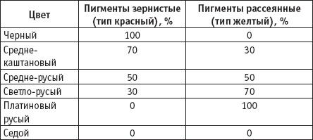 Если гранулы меланина удлиненной формы, образу ется темный цвет; круглая или овальная форма гранул обеспечивает рыжий цвет; сочетание удлиненных и овальных гранул дает рыже-коричневый оттенок, а удлиненных и небольшого количества круглых черный с рыжеватым отливом.