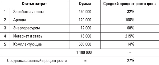 Стоит еще учесть изменение цен на рынке. Если ваши цены в среднем выросли на больший процент, чем объем продаж, на самом деле объем продаж упал. Посчитайте также индекс входящих цен (он обычно выше официального процента инфляции), т. е. высчитайте средневзвешенный процент роста цен на входящие ресурсы. В табл. 0.2 мы видим упрощенный пример, в котором средневзвешенный процент роста входящих цен составил 27 %. Если объем продаж компании в денежных единицах вырос менее чем на 27 %, следовательно, продажи компании становятся менее рентабельными (т. е. прибыль падает). Если в действительности прибыль не упала, значит, были предприняты дополнительные усилия по экономии ресурсов. Можно также сравнивать темпы роста объемов продаж и роста себестоимости; естественно, темпы роста объемов продаж должны быть выше.