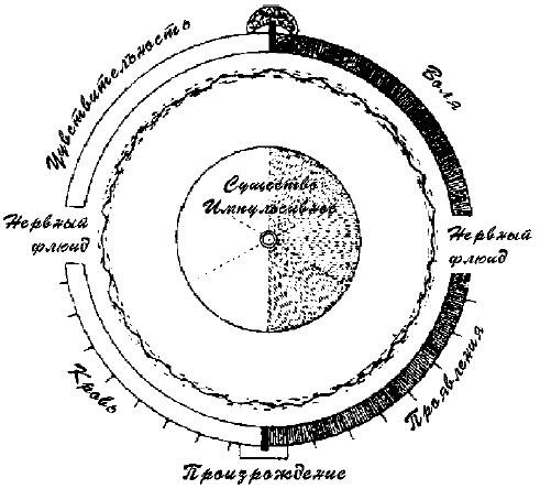 <> Центральную часть рисунка занимает импульсивный человек, пассивно поддающийся всем побуждениям, как идущим сверху (от воли), так и снизу (от организма). Он целиком погружен в поток нервной силы, соединяющий его с разумным человеком сверху и с психическим телом снизу. В левой половине схемы расположены чувствующая и принимающая части человека, в правой же волевая и двигательная.