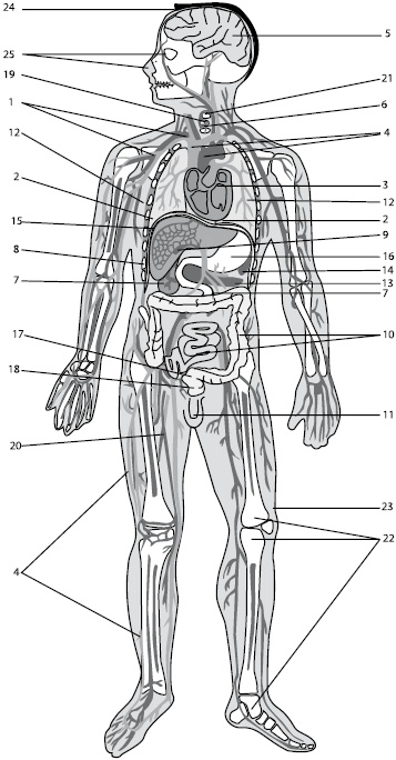 I этап: 1 кровь (повышение энергетики клеток); 2 легкие; 3 сердце; 4 сосуды; 5 головной мозг; 6 щитовидная железа; 7 почки; 8 надпочечники. II этап: 9 желудок; 10 кишечник; 11 матка, яичники, яички; 12 молочные железы. III этап: 13 поджелудочная железа; 14 селезенка; 15 печень; 16 желчный пузырь; 17 мочевой пузырь; 18 предстательная железа; 19 спинной мозг; 20 периферические нервы; 21 позвоночник; 22 суставы; 23 кожа; 24 волосы; 25 органы чувств