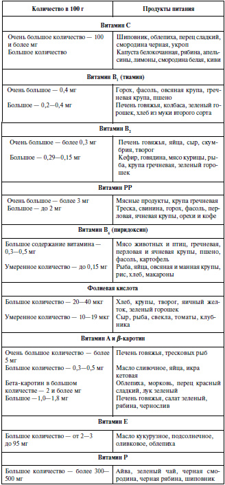 Таблица 11. Содержание витаминов в 100 г съедобной части продуктов, применяемых для питания кормящей матери