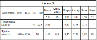 Молозиво состоит из молозивных шариков разнообразной формы. Это клетки, содержащие жировые капли. Они считаются результатом жирового перерождения лейкоцитов. Молозиво содержит иммунные тела, много ферментов: каталазу, аминазу, санолазу, пробеазу, а также редуктазу и пероксидазу. Оно богато витаминами А, В, С и др. Молозиво представляет собой концентрированную высококалорийную пищу.