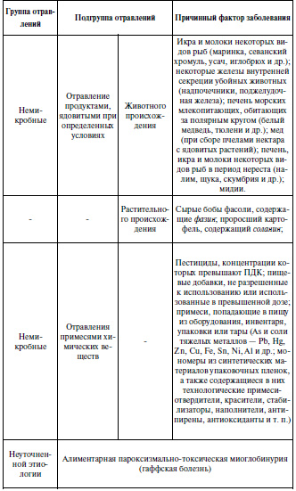 К пищевым отравлениям не относятся заболевания, вызванные поступлением в организм вместе с пищей возбудителей инфекционных и паразитарных заболеваний, случайным или преднамеренным введением в пищу какого-либо яда, пищевые аллергии, алкогольные и наркотические отравления, связанные с приемом этих веществ внутрь, а также отравления, связанные с избыточным поступлением с пищей лекарственных или пищевых веществ (витамины, минеральные соли и т. п.).