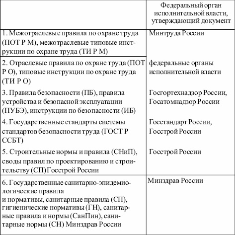 В соответствии с постановлением Правительства РФ «О нормативных правовых актах, содержащих государственные нормативные требования охраны труда» система нормативных правовых актов, содержащих государственные нормативные требования охраны труда, состоит из межотраслевых и отраслевых правил и типовых инструкций по охране труда, строительных и санитарных норм и правил, правил и инструкций по безопасности, правил устройства и безопасной эксплуатации, сводов правил по проектированию и строительству, гигиенических нормативов и государственных стандартов безопасности труда.