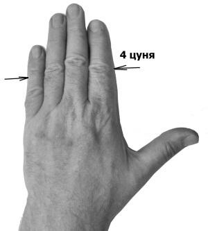 1 цунь это ширина большого пальца левой руки (у мужчин) по линии, проходящей через угол ногтевого ложа (фото 3). У женщин можно использовать для измерения обе руки.