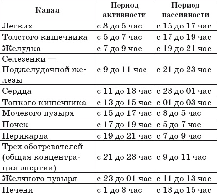 Энергия проходит по каналам последовательно в течение суток, перетекая из одного канала в другой. За 24 часа совершается энергетический кругооборот. Лучше всего воздействовать на определенный канал в период его максимальной активности. Если этот период приходится на время сна, можно использовать для работы время общей концентрации энергии с 21 до 23 часов. Но главное не проводить терапию в период пассивности канала.