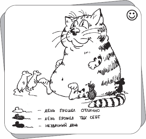 Далее давайте поговорим о том, как изготовить подобный листок настроения. Здесь все зависит от вашей фантазии. Я предлагаю вариант с котом, где мышки представляют собой определенные показатели. Так, если большинство детей остались довольны прожитым днем, нашли для себя интересные и увлекательные занятия, то день считается отличным. Соответственно, рядом с котом приклеивается белая мышка. Если день оказался не очень интересным, но и особых неприятностей у отряда не было, то на листок настроения можно поместить серую мышку. Когда же пройденный день можно без сожаления вычеркнуть из этой смены, приходит очередь черной мышки. Конечно же, кота и мышей желательно изготовить заранее.