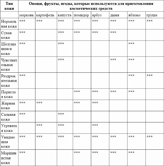 По приведенной ниже таблице вы сможете определить, какие фрукты или овощи подходят для вашей кожи. Используя их, можно приготовить прекрасные витаминные маски. Фрукты и овощи, созревающие осенью, содержат аминокислоты, витамины и масла, стимулирующие кожу и питающие ее необходимыми веществами.