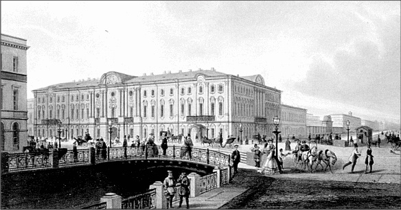 Строгановский дворец со стороны Зеленого моста. Художники Ж. Жакотте и Г.Л. Регаме. Начало XIX в.