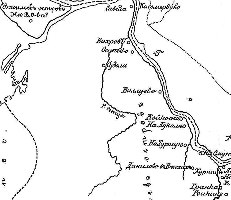 На острове обозначено множество деревень: Таибала, Васкино, Левкуевское, Лигомовичи Тимуево, Освевское, Петчела, Селезнево, Лембитово Седенье, Сукино, Толстые Головы. Практически все названия имеют славянское звучание. К настоящему времени ни одно из этих названий не сохранилось и местоположения этих деревень установить невозможно. Также обозначена «деревня Судола на Селуи». Большинство историков сходятся во мнении, что эта деревня станет известной впоследствии как Волкова.